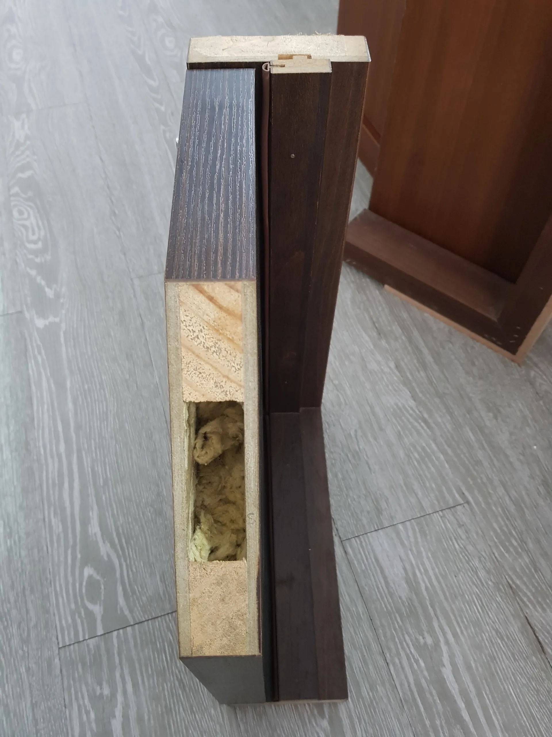 Được làm bằng gỗ tự nhiên đã qua xử lý, ở hai mặt khung xương được ép bằng hai tấm da gỗ công nghiệp MDF , ). Là bột gỗ đã qua xử lý và trộn keo chuyên dụng ép ở nhiệt độ và áp suất trung bình tạo thành tấm, bề mặt ván MDF được ép thêm hai lớp Veneer tạo nên bề mặt có vân gỗ thật và liền lạc. Lớp Veneer được ép lên bề mặt đa dạng và phong phú , vân đẹp