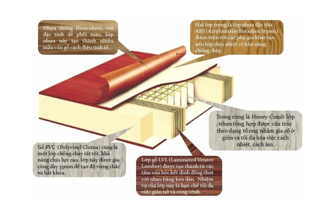Tiếp đến là lớp nhựa ABS và được kết hợp pha trộn với các chất phụ gia khác làm tăng khả năng chống cháy và chịu nhiệt nằm ngay phía trong của lớp bề mặt cửa.